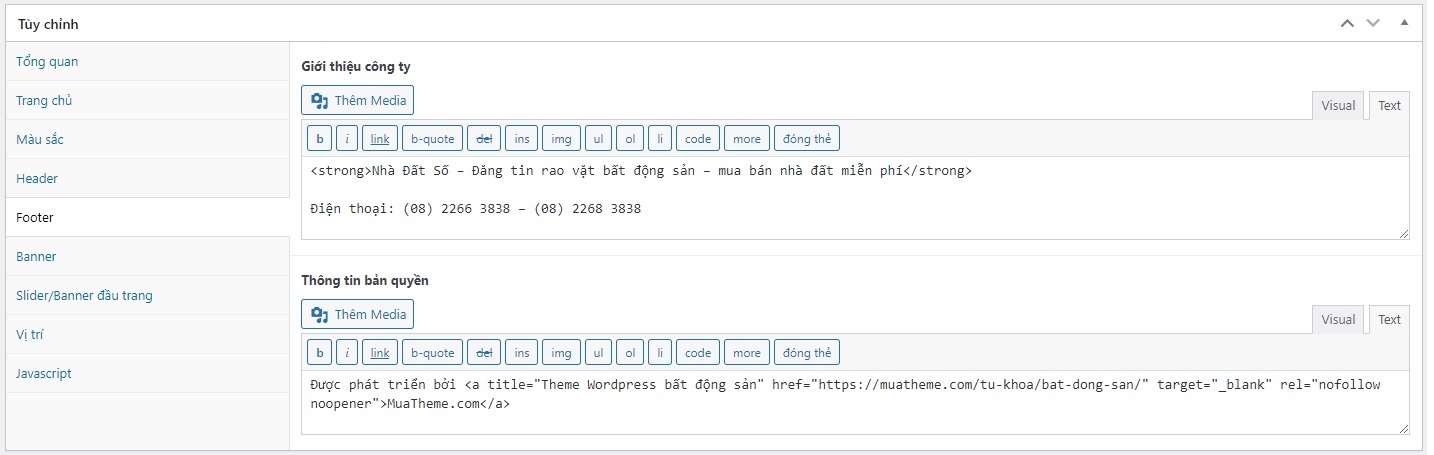 Cấu hình Footer (chân trang)- Giới thiệu, bản quyền
